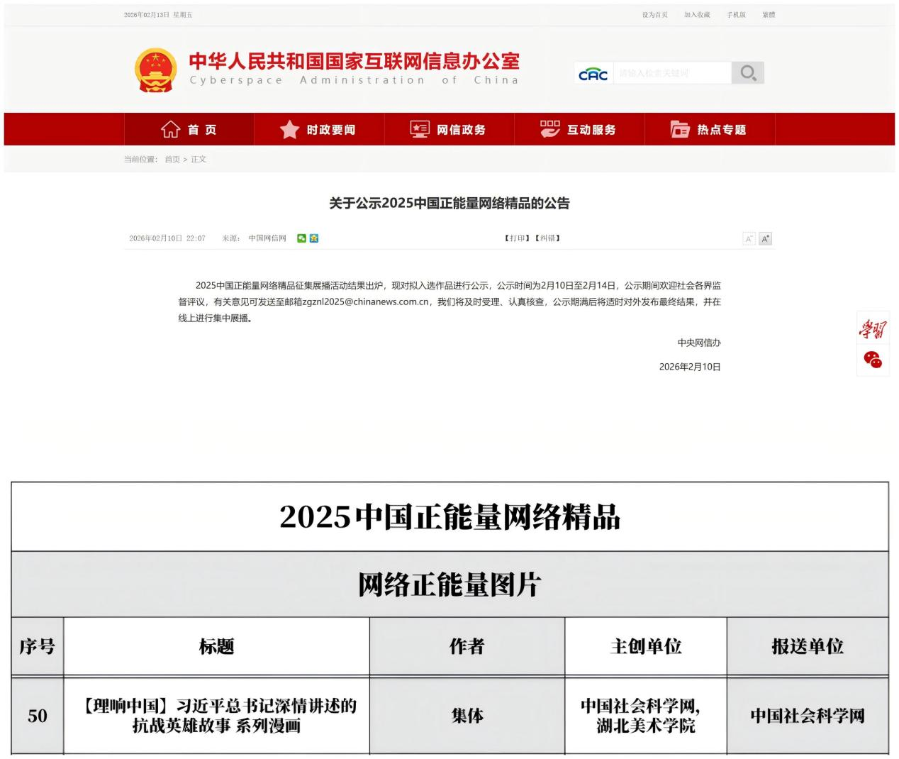近日,中央网信办2025中国正能量网络精品征集展播活动拟入选名单公示,由中国社会科学网报送、湖北美术学院与中国社会科学网联合主创的《习近平总书记深情讲述的抗战英雄故事》系列漫画成功入选网络正能量图片类别,这是该作品在红色文化传播领域斩获的一项重要荣誉,也是对高校以艺术赋能正能量传播实践的高度肯定。