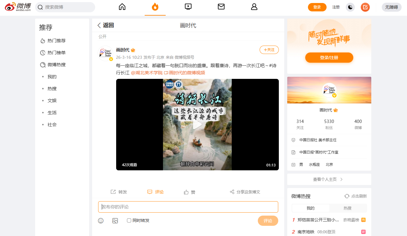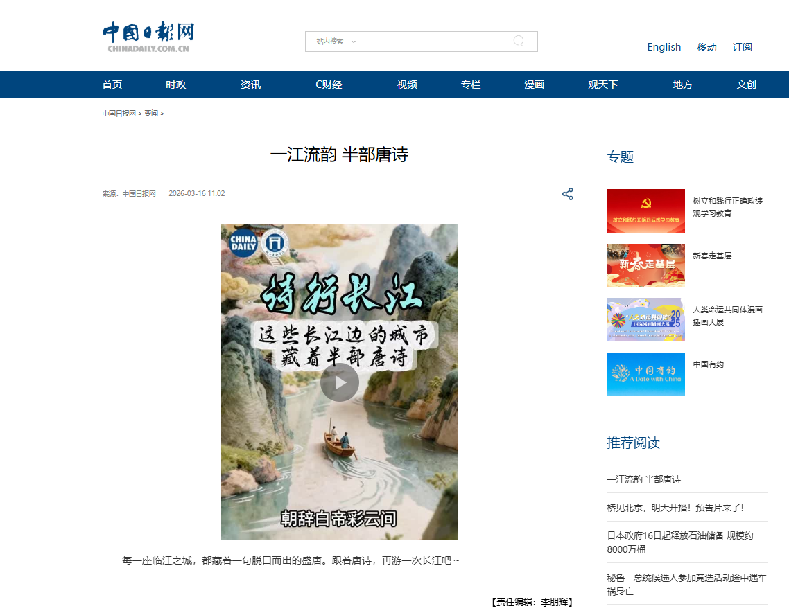 影视动画学院“动‘话’时代 艺绘中国”工作室《长江生态与人文》系列第七期作品《一江流韵 半部唐诗》在中国日报网、中国日报视频号、中国日报官方微博等多媒体平台发布。
