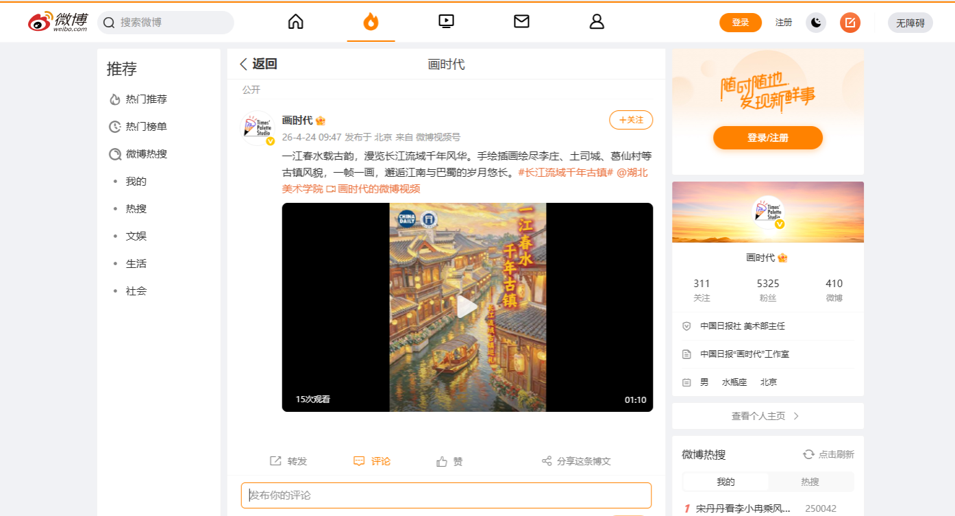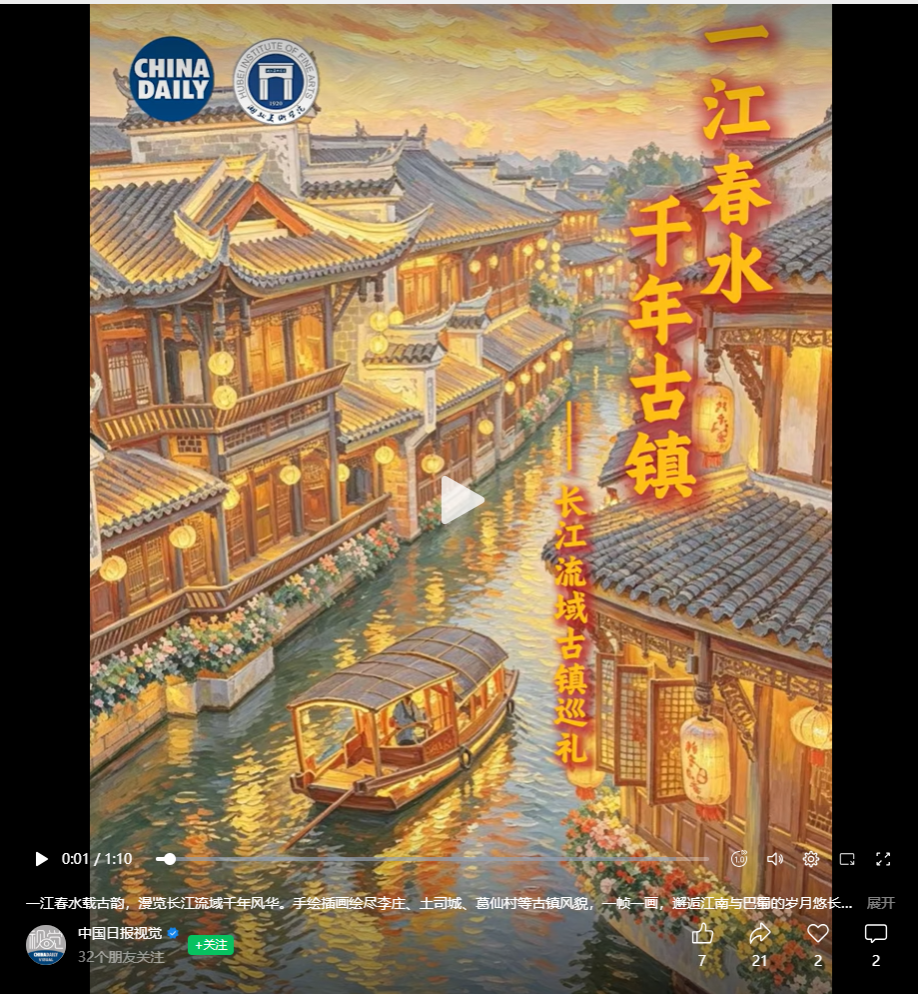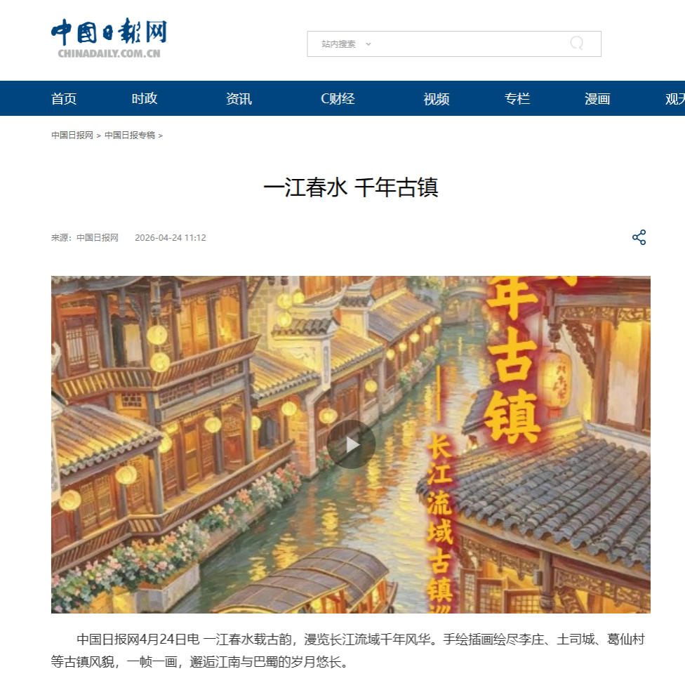 影视动画学院“动‘话’时代 艺绘中国”工作室《长江生态与人文》系列第八期作品《一江春水 千年古镇》在中国日报网、中国日报视频号、中国日报官方微博等多媒体平台发布。