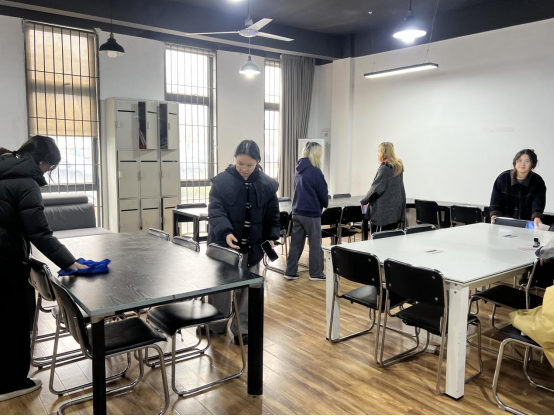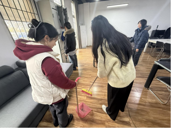 在各卫生包干区域,同学们对散落的画具、器材进行归整与清洁,对画架、桌椅、储物设施进行擦拭,并对地面、窗户及各类卫生死角进行了全面清理。从凌乱到有序,从积尘到明净,教室环境焕然一新。