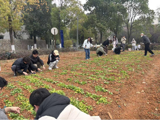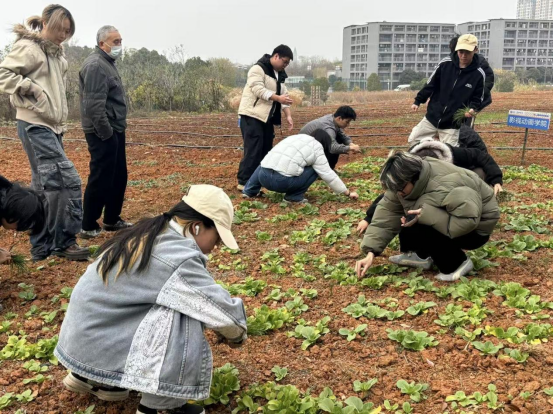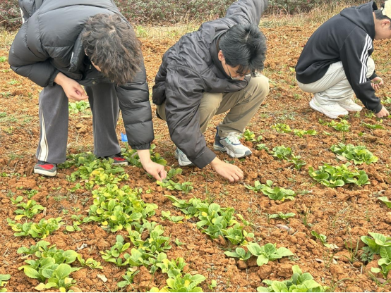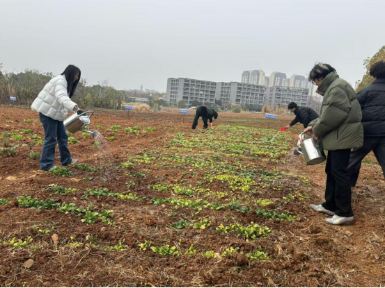 与此同时,在学院的劳动责任田中,同学们开展了细致的农事劳作。大家分工协作,有人仔细拔除杂草,有人负责将有机肥料均匀撒施在菜苗根部,还有人接力提水缓缓浇灌菜苗,确保水分充分渗透。经过松土、除草、施肥、浇水的完整养护,责任田土壤更显疏松肥沃,菜苗也在冬日暖阳下呈现出鲜润挺拔的生长姿态,新叶舒展,绿意盎然,呈现出勃勃生机。