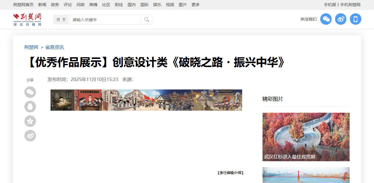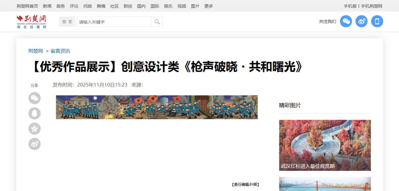 近日,由辛亥革命博物院、武汉市中山舰博物馆、辛亥革命博物院・武汉大学国家革命文物协同研究中心联合主办的“百年辛亥民族丰碑——‘孙中山与辛亥革命’文物传播大赛”优秀作品展线上专题正式上线。影视动画学院“动‘话’时代,艺绘中国”工作室师生团队创作的《破晓之路・振兴中华》《枪声破晓・共和曙光》两件作品,在全国417件参赛作品中脱颖而出,入选创意设计类优秀作品,成为高校以艺术之力传承革命文化的生动范例。