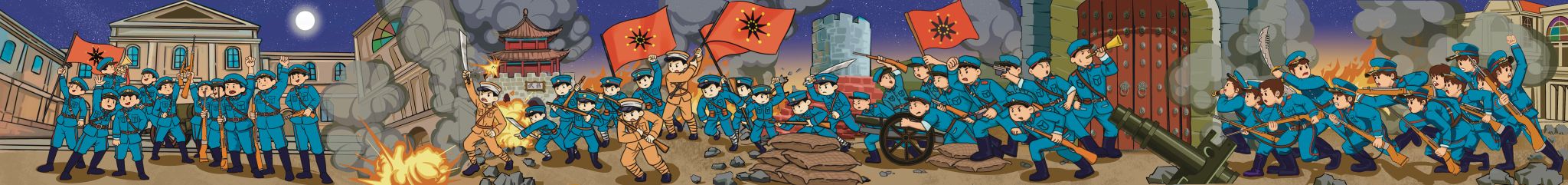 设计说明:该作品以孙中山先生励志振兴中华、成立同盟会、民族觉醒、保路运动、辛亥革命等历史故事线为创作思路,通过漫画的艺术表现形式,展示历史事件的标志性场景,再现冲破封建帝制枷锁、开启民主共和新纪元的历史脉络。