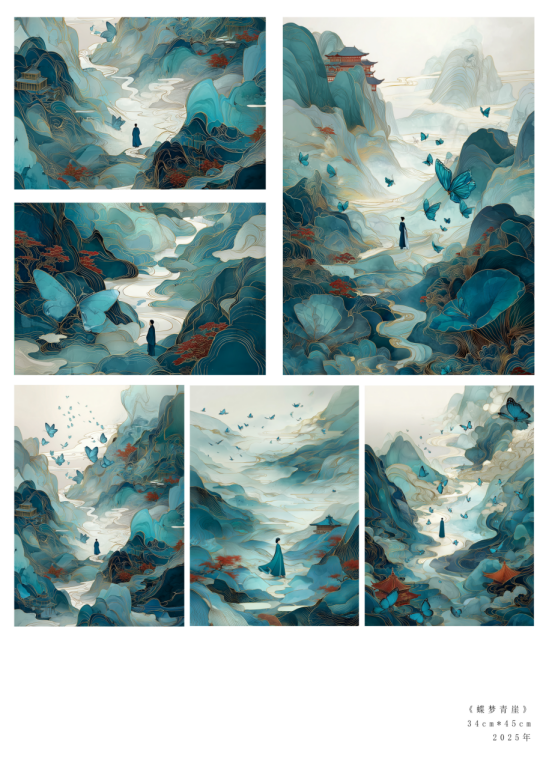 此次参赛中,学院学子在文创产品设计、IP形象设计两大核心类别中均表现亮眼:岳鑫海、王悦馨、韩淼、张艾琁、李临澜创作的《蝶梦青崖》凭借对“庄周梦蝶”经典意象的创新性演绎,将东方美学意境与现代文创功能完美融合,获得文创产品设计一等奖;彭雨萱、张艾琁、叶苏婷、李临澜、肖诗琪创作的《墨韵鲸影》以水墨笔触勾勒庄子文化中的逍遥意境,获得文创产品设计三等奖;王悦馨、彭雨萱、韩淼、张艾琁、彭冠佳创作的《庄子之道》通过具象化的IP形象诠释庄子哲学内核,获得IP形象设计三等奖。此外,学院12名研究生获1项IP形象设计优秀奖、4项IP形象设计入围奖,以及3项文创产品设计优秀奖、4项文创产品设计入围奖,充分展现了对庄子文化的深刻理解与多元创作能力。指导教师叶佑天教授始终引导学子坚守文化根脉,探索传统美学的当代视觉转化路径,提出“AIGC技术赋能东方美学”的创作理念引导学子们将庄子哲学思想与现代设计语言相结合,从主题立意挖掘、创意方案打磨到设计细节完善等方面助力学子在赛事中精准把握文化内核与创作方向,实现传统文脉与创意设计的有效衔接。