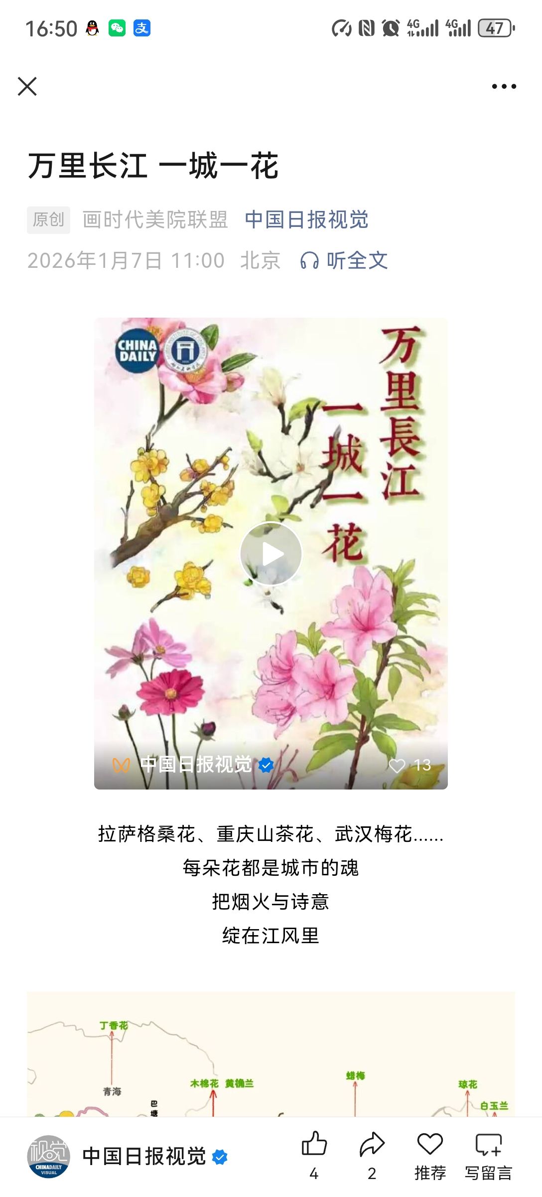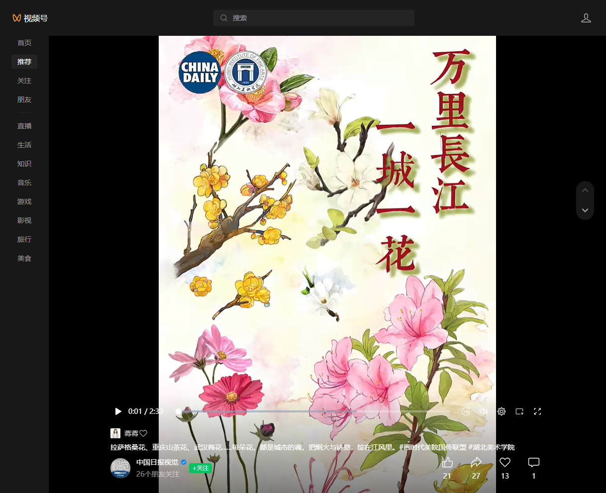 影视动画学院“动‘话’时代艺绘中国”工作室《长江生态与人文》系列第六期作品《万里长江 一城一花》在中国日报网、中国日报微信公众号、中国日报视频号、中国日报官方微博等多媒体平台发布。