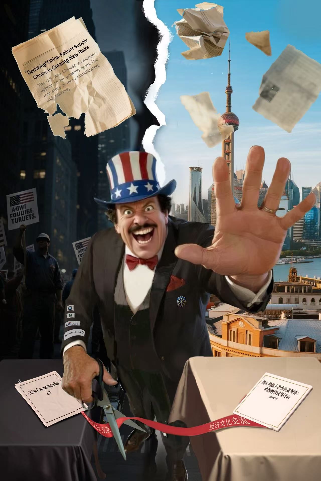 《扬言“去风险”,实为“造风险”》直击西方“双标”行径,以隐喻手法呈现西方政客以“去风险”之名破坏产业链供应链稳定、阻碍全球化进程的现实,深刻阐明此举“去机遇、去合作、去发展”的实质危害,呼应全球对合作共赢的共同期待。