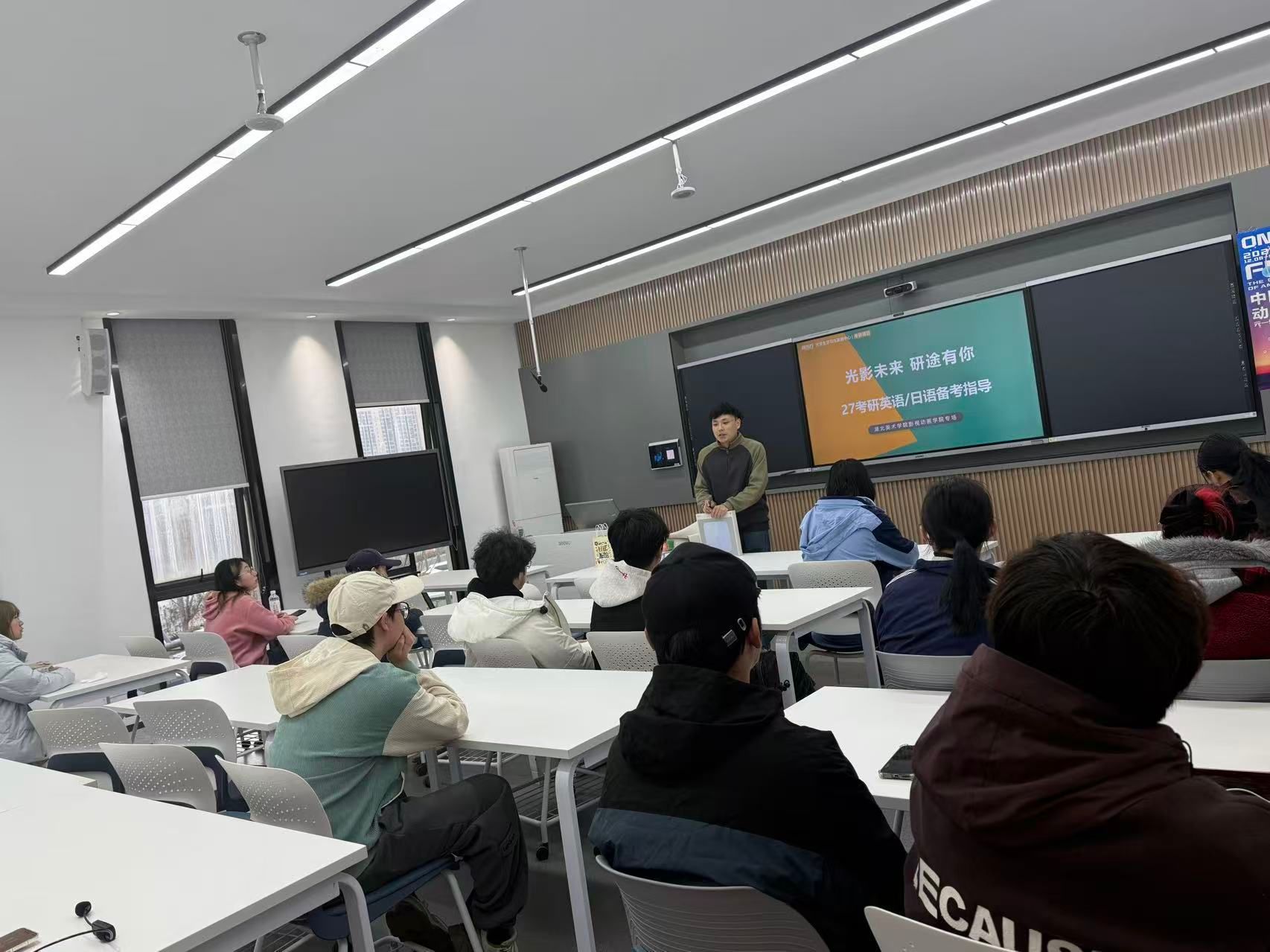 3月19日下午,学院在A10-207教室开展2027年考研英语、日语备考指导活动,重点面向大三学子提供针对性支持。指导老师系统梳理备考时间规划,明确蓄力期、攻坚期、决胜期各阶段的核心任务,分享科学高效的词汇掌握方法,现场解答学子备考过程中的各类疑问,助力大三考研学子理清备考思路、提升备考效率。